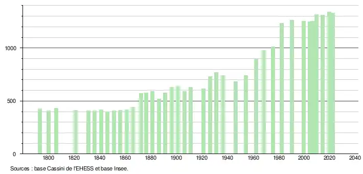 L'évolution du nombre d'habitants est connue à travers les recensements de la population effectués dans la commune depuis 1793. Pour les communes de moins de 10 000 habitants, une enquête de recensement portant sur toute la population est réalisée tous les cinq ans, les populations de référence des années intermédiaires étant quant à elles estimées par interpolation ou extrapolation[24]. Pour la commune, le premier recensement exhaustif entrant dans le cadre du nouveau dispositif a été réalisé en 2004[25].