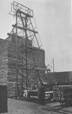 La machine était principalement composée de deux cadres triangulaires verticaux, renforcés par des entretoises. Les cadres étaient reliés à chacun des trois angles par un axe portant deux roues dentées qui actionnaient deux chaînes sans fin dans des plans verticaux parallèles aux cadres. Les chaînes portaient à intervalles réguliers des crochets destinés à recevoir et à soulever les bois équarris, qui étaient amenés au pied de la machine sur des chariots Decauville. A l'arrière de la machine se trouvaient deux paires de bras inclinés qui pouvaient être soulevés verticalement à l'aide d'un treuil actionné par un petit moteur électrique lorsque la pile prenait de la hauteur. Deux ouvriers placés à l'avant, au pied de la machine, plaçaient le bois équarri ou les poutres un par un dans les crochets fixés aux chaînes de levage. Lorsque le bois atteignait le sommet de la machine, il était basculé sur deux crochets plus longs. Ces longs crochets, tournés dans le sens inverse des crochets de levage, soutenaient le bois dans sa descente à l'arrière de la machine jusqu'à ce qu'il atteigne les bras inclinés. Ces bras prenaient le bois sur les crochets (qui continuaient à descendre avec les chaînes) et le faisaient glisser dans les mains d'un ouvrier qui se tenait sur la pile. Celui-ci passait le bois à ses collègues, qui le déposaient à sa place.