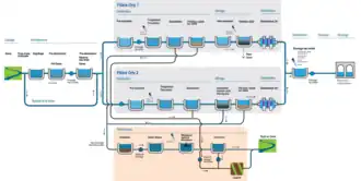 L'usine dispose de deux files pour le traitement de l'eau. La deuxième filière a été mise en service 2022, à l'issue de travaux de modernisation, afin d'améliorer le traitement des micropolluants. Une filière boue permet de prendre en charge les eaux de lavage des filtres à sable et les boues de décantation[2].