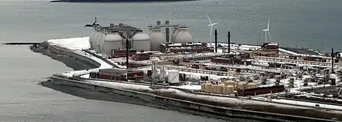 Deux éoliennes installée sur le site génèrent le reste de l'énergie requise à l'usine.