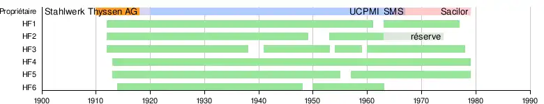 Le , les deux premiers hauts fourneaux sont mis à feu[SF 3]. Ils ont été précédés par la centrale électrique[7] et sont, logiquement, suivis par l'aciérie Thomas et le train dégrossisseur. Les 4 hauts fourneaux suivants sont démarrés dans la foulée. Pour cette première étape, l'usine se limite à la fabrication de demi-produits qui sont expédiés dans les usines allemandes[12].