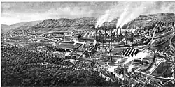 Hauts fourneaux de Fontoy 1902. À en arrière plan, l'usine du haut a trois hauts fourneaux à feu.