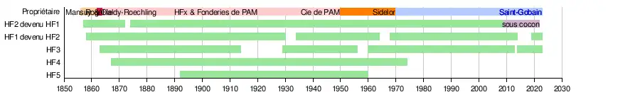 En 1970, sous la direction de Roger Martin, l'entreprise fusionne avec Saint-Gobain[3],[4]. Avec le déclin de la sidérurgie en Lorraine des années 1975-1990, le nombre de hauts-fourneaux du site redescend à trois[3], mais l'entreprise se développe et continue à produire pour les systèmes de canalisations[4].