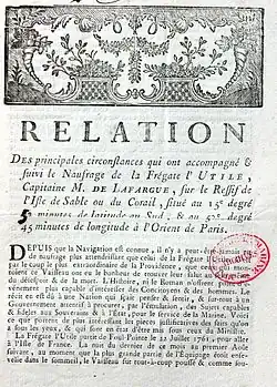 L'humanité m'engage de vous faire part qu'étant premier lieutenant sur la flûte L'Utile, j'eux le malheur d'éprouver son naufrage le sur l'isle de sable qui est au nord de l'Isle de Bourbon, sur laquelle nous réstames cinquante sept jours. Nôtre principale nouriture fût des oiseaux de mer, et leurs œufs, sans les secours desquels nos forces n'eussent pas été assés suffisantes pour construire une ambarquation des debris que nous sauvames, qui ne furent pas assés étendus pour donner assés de capacité à l'ambarquation