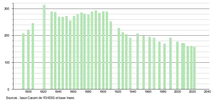 L'évolution du nombre d'habitants est connue à travers les recensements de la population effectués dans la commune depuis 1793. Pour les communes de moins de 10 000 habitants, une enquête de recensement portant sur toute la population est réalisée tous les cinq ans, les populations de référence des années intermédiaires étant quant à elles estimées par interpolation ou extrapolation[25]. Pour la commune, le premier recensement exhaustif entrant dans le cadre du nouveau dispositif a été réalisé en 2008[26].