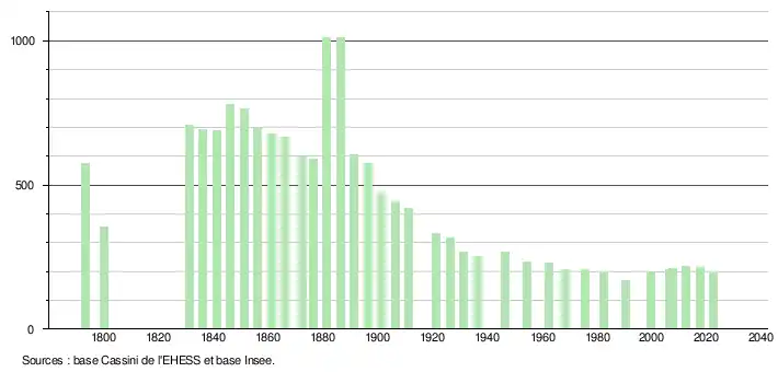 L'évolution du nombre d'habitants est connue à travers les recensements de la population effectués dans la commune depuis 1793. Pour les communes de moins de 10 000 habitants, une enquête de recensement portant sur toute la population est réalisée tous les cinq ans, les populations de référence des années intermédiaires étant quant à elles estimées par interpolation ou extrapolation[28]. Pour la commune, le premier recensement exhaustif entrant dans le cadre du nouveau dispositif a été réalisé en 2007[29].