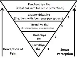Le végétarisme jaïn exclut la consommation de la chair des animaux (terrestres, marins, etc.) ainsi que la consommation des œufs (par respect pour la vie embryonnaire et afin de ne pas s'approprier ce qui vient des poules) et, enfin, refuse la consommation des racines (oignons, carottes, pommes de terre, etc.) car, « étant donné que les bulbes sont susceptibles de germer et de croître, les Jaïns voient la cueillette de ces végétaux du sol comme le meurtre de la plante entière et refusent donc de la manger [1] ».