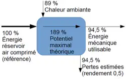 Ces valeurs sont celles du cas idéal ; en fait, les pertes du moteur sont probablement de l'ordre de 50 % (voire plus), car les meilleurs moteurs à pistons atteignent 50 % d'efficacité énergétique[22]. L’énergie réellement disponible est donc comprise entre 3,7 kWh (détente adiabatique) et 7 kWh (détente isotherme).