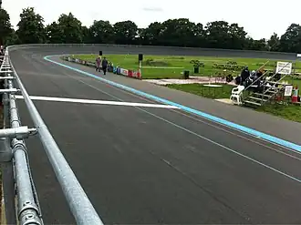 Le circuit a été conçu avec des talus de 5 pieds qui ont été surélevés par la suite. Le revêtement d'origine était du schiste rouge, qui devait être roulé à plusieurs reprises. Il fut remplacé en 1893 par des lattes de bois, ce qui donna lieu à des courses rapides mais à de fréquents accidents après la pluie[3]. Le béton fut remplacé en 1896[3].