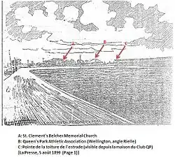 Une gravure publiée dans La Presse du 5 août 1899 (page 1) vient également confirmer la localisation du vélodrome telle que décrite dans La Patrie du 16 février 1898 (page 3)[7]. Cette illustration montre une vue vers le sud : on y aperçoit des bâtiments sur la rue Wellington