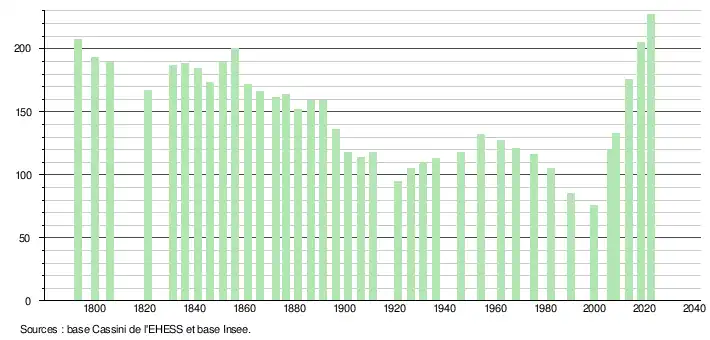 L'évolution du nombre d'habitants est connue à travers les recensements de la population effectués dans la commune depuis 1793. Pour les communes de moins de 10 000 habitants, une enquête de recensement portant sur toute la population est réalisée tous les cinq ans, les populations de référence des années intermédiaires étant quant à elles estimées par interpolation ou extrapolation[34]. Pour la commune, le premier recensement exhaustif entrant dans le cadre du nouveau dispositif a été réalisé en 2008[35].