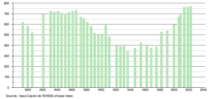 L'évolution du nombre d'habitants est connue à travers les recensements de la population effectués dans la commune depuis 1793. Pour les communes de moins de 10 000 habitants, une enquête de recensement portant sur toute la population est réalisée tous les cinq ans, les populations de référence des années intermédiaires étant quant à elles estimées par interpolation ou extrapolation[17]. Pour la commune, le premier recensement exhaustif entrant dans le cadre du nouveau dispositif a été réalisé en 2008[18].