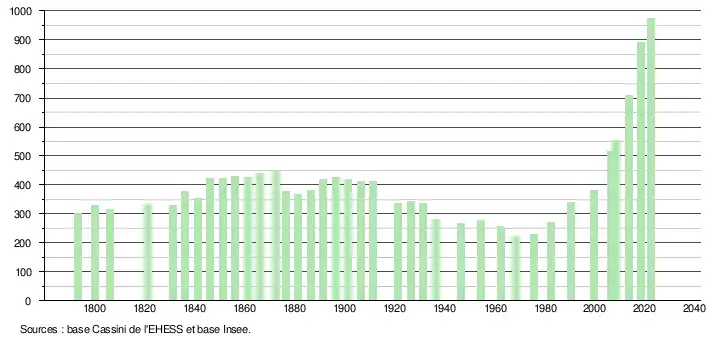 L'évolution du nombre d'habitants est connue à travers les recensements de la population effectués dans la commune depuis 1793. Pour les communes de moins de 10 000 habitants, une enquête de recensement portant sur toute la population est réalisée tous les cinq ans, les populations de référence des années intermédiaires étant quant à elles estimées par interpolation ou extrapolation[17]. Pour la commune, le premier recensement exhaustif entrant dans le cadre du nouveau dispositif a été réalisé en 2008[18].