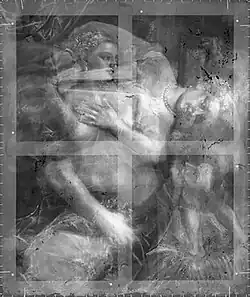 La radiographie publiée par Fern Rusk Shapley en 1972[15] révèle que l'exemplaire de Washington a été peint sur une toile précédemment utilisée pour un double portrait avec une femme élégante et un homme en armure. Selon Giorgio Tagliaferro, le tableau original est probablement l'œuvre du jeune élève Pâris Bordone étant donné la disposition attribuable à ses méthodes[16], une hypothèse cependant jugée peu défendable selon Humfrey[1]. Titien a ensuite fait pivoter la toile en la plaçant verticalement et y a peint sa nouvelle Vénus, réutilisant le manteau de l'homme comme couverture pour les jambes de la déesse.