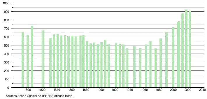 L'évolution du nombre d'habitants est connue à travers les recensements de la population effectués dans la commune depuis 1793. Pour les communes de moins de 10 000 habitants, une enquête de recensement portant sur toute la population est réalisée tous les cinq ans, les populations de référence des années intermédiaires étant quant à elles estimées par interpolation ou extrapolation[30]. Pour la commune, le premier recensement exhaustif entrant dans le cadre du nouveau dispositif a été réalisé en 2007[31].