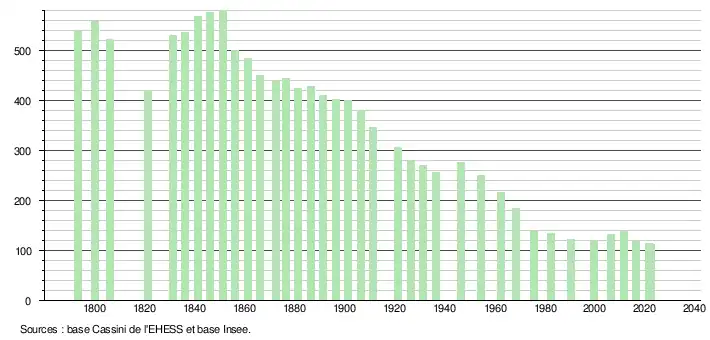 L'évolution du nombre d'habitants est connue à travers les recensements de la population effectués dans la commune depuis 1793. Pour les communes de moins de 10 000 habitants, une enquête de recensement portant sur toute la population est réalisée tous les cinq ans, les populations de référence des années intermédiaires étant quant à elles estimées par interpolation ou extrapolation[14]. Pour la commune, le premier recensement exhaustif entrant dans le cadre du nouveau dispositif a été réalisé en 2006[15].