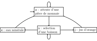 On donne ici l'exemple d'un distributeur de boissons qui peut être dans 4 états[11] : attente d'une pièce de monnaie, sélection d'une boisson, distribution d'une bouteille d'eau minérale et distribution d'une bouteille de jus d'orange.