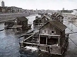 Les moulins de l'Adige étaient caractéristiques de Vérone. Construits sur une plate-forme flottante ou pontone, ils pouvaient s'adapter aux différents niveaux d'eau du fleuve. Sur le pontone se trouvaient la roue et un cabanon en bois qui abritait la meule, tandis qu'un petit ponton appelé peagno les reliait à la berge. Attestés depuis le Moyen Âge, nombre d'entre eux étaient contrôlés par les différents monastères de la région qui, durant l'Antiquité, avaient le droit d'exploiter les eaux du fleuve.