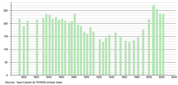 L'évolution du nombre d'habitants est connue à travers les recensements de la population effectués dans la commune depuis 1793. Pour les communes de moins de 10 000 habitants, une enquête de recensement portant sur toute la population est réalisée tous les cinq ans, les populations de référence des années intermédiaires étant quant à elles estimées par interpolation ou extrapolation[51]. Pour la commune, le premier recensement exhaustif entrant dans le cadre du nouveau dispositif a été réalisé en 2007[52].
