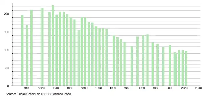 L'évolution du nombre d'habitants est connue à travers les recensements de la population effectués dans la commune depuis 1793. Pour les communes de moins de 10 000 habitants, une enquête de recensement portant sur toute la population est réalisée tous les cinq ans, les populations de référence des années intermédiaires étant quant à elles estimées par interpolation ou extrapolation[31]. Pour la commune, le premier recensement exhaustif entrant dans le cadre du nouveau dispositif a été réalisé en 2007[32].