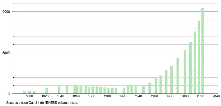 L'évolution du nombre d'habitants est connue à travers les recensements de la population effectués dans la commune depuis 1793. Pour les communes de moins de 10 000 habitants, une enquête de recensement portant sur toute la population est réalisée tous les cinq ans, les populations de référence des années intermédiaires étant quant à elles estimées par interpolation ou extrapolation[22]. Pour la commune, le premier recensement exhaustif entrant dans le cadre du nouveau dispositif a été réalisé en 2007[23].