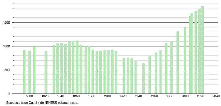 L'évolution du nombre d'habitants est connue à travers les recensements de la population effectués dans la commune depuis 1793. Pour les communes de moins de 10 000 habitants, une enquête de recensement portant sur toute la population est réalisée tous les cinq ans, les populations de référence des années intermédiaires étant quant à elles estimées par interpolation ou extrapolation[20]. Pour la commune, le premier recensement exhaustif entrant dans le cadre du nouveau dispositif a été réalisé en 2008[21].