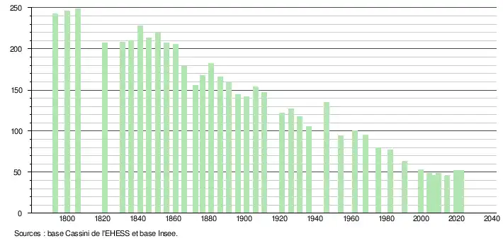L'évolution du nombre d'habitants est connue à travers les recensements de la population effectués dans la commune depuis 1793. Pour les communes de moins de 10 000 habitants, une enquête de recensement portant sur toute la population est réalisée tous les cinq ans, les populations de référence des années intermédiaires étant quant à elles estimées par interpolation ou extrapolation[14]. Pour la commune, le premier recensement exhaustif entrant dans le cadre du nouveau dispositif a été réalisé en 2004[15].