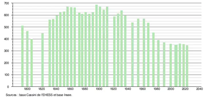 L'évolution du nombre d'habitants est connue à travers les recensements de la population effectués dans la commune depuis 1793. Pour les communes de moins de 10 000 habitants, une enquête de recensement portant sur toute la population est réalisée tous les cinq ans, les populations de référence des années intermédiaires étant quant à elles estimées par interpolation ou extrapolation[26]. Pour la commune, le premier recensement exhaustif entrant dans le cadre du nouveau dispositif a été réalisé en 2007[27].