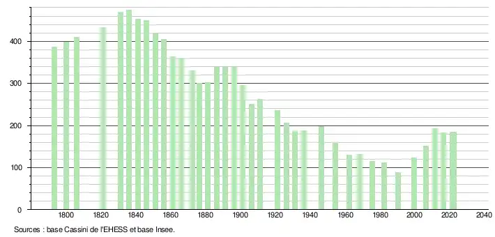 L'évolution du nombre d'habitants est connue à travers les recensements de la population effectués dans la commune depuis 1793. Pour les communes de moins de 10 000 habitants, une enquête de recensement portant sur toute la population est réalisée tous les cinq ans, les populations de référence des années intermédiaires étant quant à elles estimées par interpolation ou extrapolation[19]. Pour la commune, le premier recensement exhaustif entrant dans le cadre du nouveau dispositif a été réalisé en 2006[20].