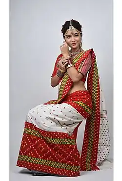 Un sari ou sari [21],[22] est un vêtement féminin dans le sous-continent indien[23]. Un sari est une bande de tissu non cousu, d'une longueur de quatre à neuf mètres, qui est drapée sur le corps dans différents styles. En voici quelques-uns : Sambalpuri Saree de l'Est, soie Mysore et Ilkal du Karnataka et Kanchipuram du Tamil Nadu du Sud, Paithani du Maharashtra et Banarasi du Nord, entre autres[24]. Le style le plus courant est celui où le sari est enroulé autour de la taille, l'une des extrémités étant ensuite drapée sur l'épaule pour dégager le ventre[23]. Le sari est généralement porté sur un jupon[25]. Le chemisier peut être « dos nu » ou de style « dos nu ». Ils sont généralement plus habillés et comportent de nombreux ornements tels que des miroirs ou des broderies et peuvent être portés lors d'occasions spéciales. Les femmes dans les forces armées, lorsqu'elles portent un uniforme de sari, portent une chemise à demi-manches rentrée dans la taille. Les adolescentes peuvent porter des demi-saris, un ensemble de trois pièces composé d'un langa, d'un choli et d'une étole enroulée dessus comme un sari. Les femmes portent généralement des saris complets. Les saris de mariage indiens sont généralement rouges ou roses, une tradition qui remonte à l'histoire pré-moderne de l'Inde[26].