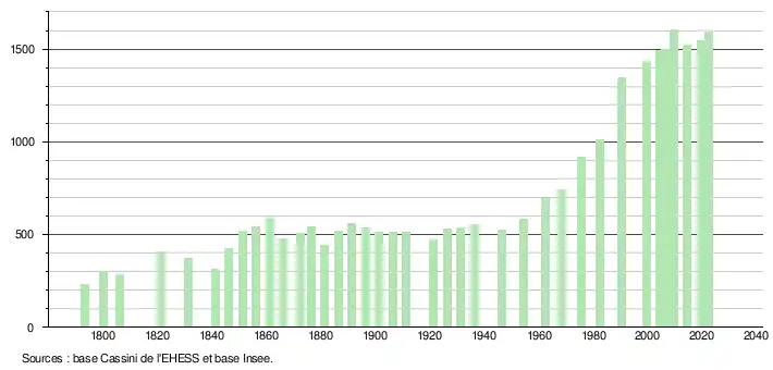 L'évolution du nombre d'habitants est connue à travers les recensements de la population effectués dans la commune depuis 1793. Pour les communes de moins de 10 000 habitants, une enquête de recensement portant sur toute la population est réalisée tous les cinq ans, les populations de référence des années intermédiaires étant quant à elles estimées par interpolation ou extrapolation[38]. Pour la commune, le premier recensement exhaustif entrant dans le cadre du nouveau dispositif a été réalisé en 2004[39].