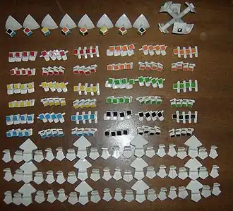 Il y a 60 pièces sur les arêtes qui arborent chacune deux couleurs différentes, et huit coins qui en arborent 3. Chaque arête est constituée d'un quintet de pièces de bords et possède une unique combinaison de couleurs, mais toutes les combinaisons ne sont pas possibles (par exemple, il n'y a pas de pièce de bord avec simultanément du noir et du jaune car ces deux couleurs sont opposées sur le cube résolu et n'ont aucune arête en commun).