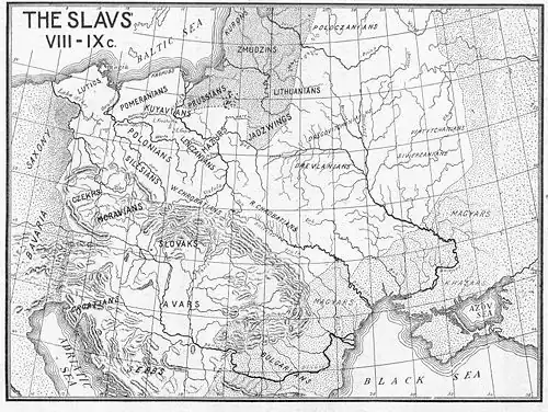 - Les peuples baltes sont répartis entre la Vistule et le golfe de Finlande. Les Prussiens (Pruzzen) entre la Vistule et le Niémen, proche des Lituaniens, les Lituaniens, divisés en tribus nombreuses (dont les Schmudes, en Samogitie), dans le bassin du Niémen, les Lettons (Lettgalles, Zemgales, Seles) autour du golfe de Rīga, les Lives et les Estes au nord, jusqu’au golfe de Finlande, Finno-ougriens apparentés aux tribus finlandaises. Des commerçants et aventuriers scandinaves colonisent la région des pays baltes à partir du VIIe siècle, puis remontent les fleuves comme la Dvina, la Bérézina, le Dniepr pour atteindre Constantinople au IXe siècle. La chronique de Nestor (vers 1115) énumère les peuples baltes ayant payé tribut au prince de Kiev : les Lives, les Samigotes, les Pruzzes et les Čud (Estes)[33].