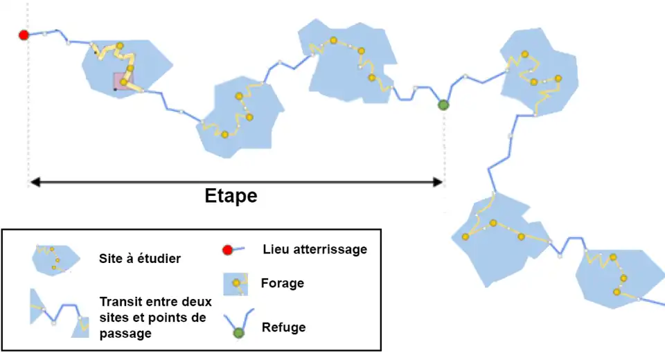 - Une fois sur un site l'astromobile commence par mesurer le degré d'hydratation de la surface en utilisant les instruments NSS, NIRVSS et MSOLO et en se déplaçant à une vitesse inférieure à 10 cm/seconde. Les caractéristiques du terrain sont relevées (température, géomorphologie, minéralogie). À la suite des observations in situ, les sites prévus pour les forage sont validés ou éventuellement modifiés. Sur chaque site, trois forages séparés de quelques dizaines de mètres sont effectués. Toutefois, lorsque le site est de type PSR (terrain perpétuellement à l'ombre / glace d'eau en surface), un seul forage sera effectué pour prendre en compte les contraintes thermiques et énergétiques propres à ce type de site. Les mesures des éléments volatils doivent être effectuées sur 10 à 15% de la superficie du site et l'astromobile doit parcourir au minimum 224 mètres à l'intérieur de son périmètre[37].