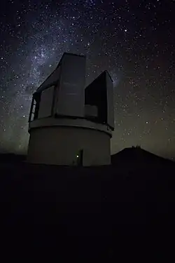Image de l'extérieur de VISTA pendant une nuit étoilée.Les objectifs scientifiques relevés faits avec VISTA, qui ont débuté en 2010, incluent bon nombre des problèmes les plus passionnants de l'astrophysique aujourd'hui, allant de la nature de l'énergie noire à la menace des astéroïdes proches de la Terre[1]. Six grands relevés publics sont menés par VISTA :