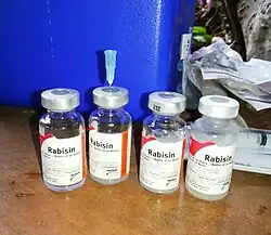 Il existe plusieurs vaccins lyophilisés contre la rage, citons par exemple Imovax Rage et VACCIN RABIQUE PASTEUR/Verorab (Sanofi Pasteur), ainsi que RabAvert (GSK). Le premier est cultivé sur des cellules diploïdes humaines. Il est composé de 2,5 UI d’antigène du virus de la rage, 100 mg d’albumine humaine, 150 µg de néomycine et de 20 µg de rouge de phénol et dilué avec de l'eau stérile. Le second est cultivé sur des cellules Véro et contient 3,25 UI du virus de la rage, souche WISTAR Rabies PM/WI38 1503-3M, ainsi que de l'albumine humaine[5]. Après reconstitution avec 0,5 mL de solvant, le vaccin est prêt à l'emploi. Le troisième, RabAvert, est lui cultivé sur des cellules d’embryon de poulet purifiées. Il est composé de 2,5 UI d’antigène du virus de la rage, de 12 mg de polygéline, de 0,3 mg d’albumine sérique humaine, de moins d'1 µg de néomycine, de 0,02 µg de chlortétracycline, de 0,002 µg d’amphotéricine B, de 0,003 µg d’ovalbumine ainsi que d'eau stérile[6].