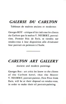 Il expose aussi à la galerie du Carlton et se tient à la disposition des clients afin d’exécuter leurs portraits.