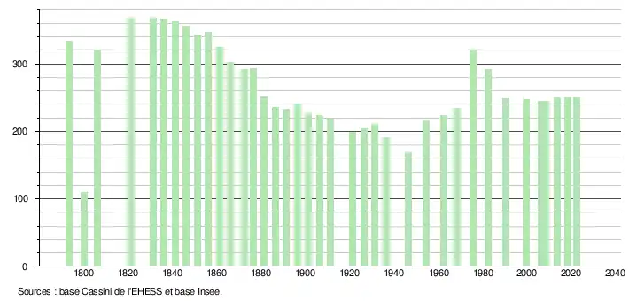L'évolution du nombre d'habitants est connue à travers les recensements de la population effectués dans la commune depuis 1793. Pour les communes de moins de 10000habitants, une enquête de recensement portant sur toute la population est réalisée tous les cinqans, les populations de référence des années intermédiaires étant quant à elles estimées par interpolation ou extrapolation[26]. Pour la commune, le premier recensement exhaustif entrant dans le cadre du nouveau dispositif a été réalisé en 2008[27].
