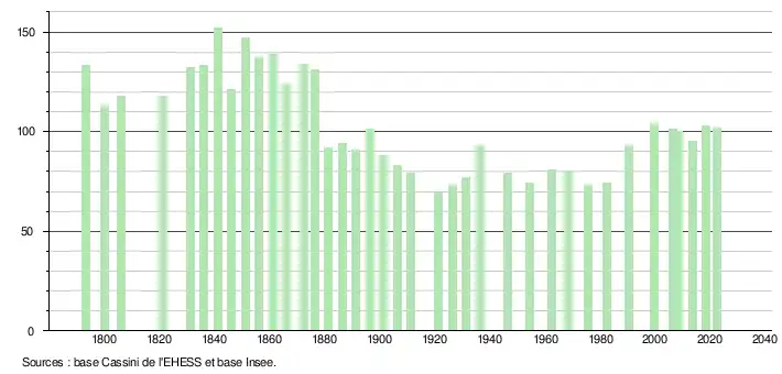 L'évolution du nombre d'habitants est connue à travers les recensements de la population effectués dans la commune depuis 1793. Pour les communes de moins de 10 000 habitants, une enquête de recensement portant sur toute la population est réalisée tous les cinq ans, les populations de référence des années intermédiaires étant quant à elles estimées par interpolation ou extrapolation[20]. Pour la commune, le premier recensement exhaustif entrant dans le cadre du nouveau dispositif a été réalisé en 2008[21].
