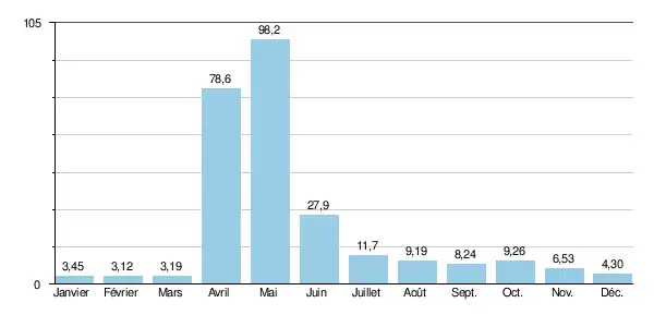 Le débit moyen mensuel observé en février (minimum d'étiage) est de 3,12 m3/s, soit seulement 3 % du débit moyen du mois de mai (98,2 m3/s), ce qui souligne l'amplitude très élevée des variations saisonnières. Sur la durée d'observation de 39 ans, le débit mensuel minimal a été de 1,20 m3/s en - été de sécheresse mémorable en France également -, tandis que le débit mensuel maximal s'élevait à 397 m3/s en . Un débit mensuel inférieur à 1,7 m3 est rarissime.