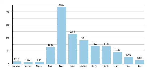 Le débit moyen mensuel observé en février (minimum d'étiage) est de 1,67 m3/s, soit moins de 4 % du débit moyen du mois de mai (43,5 m3/s), ce qui montre l'amplitude fort élevée des variations saisonnières. Les écarts de débit mensuel peuvent être encore plus marqués d'après les années : sur la durée d'observation de 51 ans, le débit mensuel minimal a été de 0,15 m3/s (150 L/s) en , tandis que le débit mensuel maximal s'élevait à 103 m3/s en .
