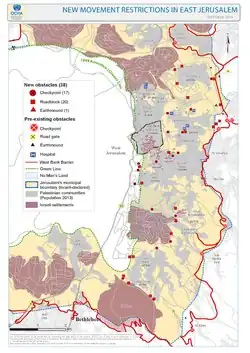 Le , la police israélienne annonce la levée des barrages mis en place à l'entrée de plusieurs quartiers arabes de Jérusalem-Est pour faire face à la récente vague de violences anti-israélienne à Jérusalem-Est. La police israélienne a déclaré dans un communiqué que ces mesures sont la « conséquence directe d'une certaine stabilisation de la situation sécuritaire, qui permet cette politique plus clémente et doit autoriser le public à retrouver une vie normale »[118].
