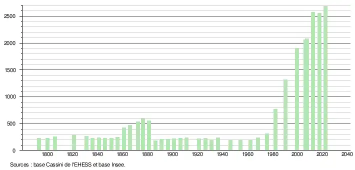 L'évolution du nombre d'habitants est connue à travers les recensements de la population effectués dans la commune depuis 1793. Pour les communes de moins de 10 000 habitants, une enquête de recensement portant sur toute la population est réalisée tous les cinq ans, les populations de référence des années intermédiaires étant quant à elles estimées par interpolation ou extrapolation[33]. Pour la commune, le premier recensement exhaustif entrant dans le cadre du nouveau dispositif a été réalisé en 2007[34].