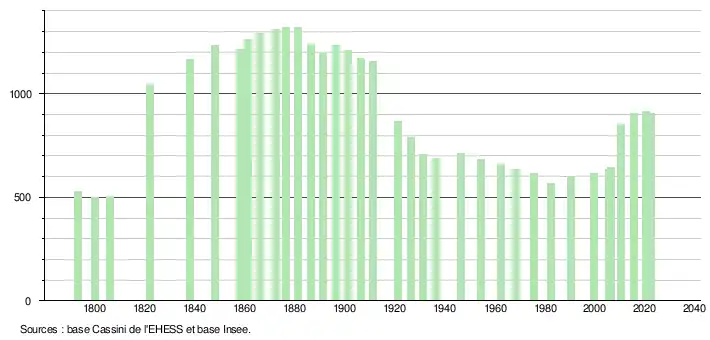L'évolution du nombre d'habitants est connue à travers les recensements de la population effectués dans la commune depuis 1793. Pour les communes de moins de 10 000 habitants, une enquête de recensement portant sur toute la population est réalisée tous les cinq ans, les populations de référence des années intermédiaires étant quant à elles estimées par interpolation ou extrapolation[10]. Pour la commune, le premier recensement exhaustif entrant dans le cadre du nouveau dispositif a été réalisé en 2005[11].