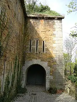 La limite du bourg avec Lyon se concrétise au début du XIIIe siècle : l'archevêque et comte de Lyon[n 5], pour défendre l'entrée nord de sa ville, fait bâtir sur le promontoire rocheux qui dominait la voie romaine, une forteresse, le château de Pierre Scize ; au pied de cette place forte, la porte de la ville est placée sur l'étroit défilé de Pierre Scize[33]. À partir de 1312 et l'intégration de Lyon dans le royaume de France, c'est là que les souverains sont le plus souvent accueillis et les simples sujets contrôlés. Sur la Saône, des chaînes limitent le passage des embarcations. Louis XI s'approprie la forteresse et en fait une prison d'État.