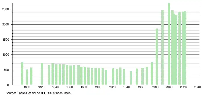 L'évolution du nombre d'habitants est connue à travers les recensements de la population effectués dans la commune depuis 1793. Pour les communes de moins de 10 000 habitants, une enquête de recensement portant sur toute la population est réalisée tous les cinq ans, les populations de référence des années intermédiaires étant quant à elles estimées par interpolation ou extrapolation[24]. Pour la commune, le premier recensement exhaustif entrant dans le cadre du nouveau dispositif a été réalisé en 2004[25].