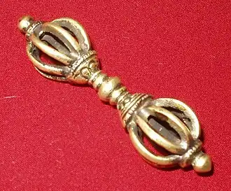 « Terme sanscrit (en tibétain : dordje) pour désigner un instrument rituel du Bouddhisme tantrique, composé d'un grain central (bindu) germe de l'esprit, axe et cœur de l'univers, et de fleurs de lotus symétriques, dont jaillissent deux groupes de cinq flammes exprimant la disposition des cinq Dhyani-Bouddhas, destinés à se rejoindre comme les flammes dans la nature transcendante de l'Adi-Bouddha primordial, dont l'esprit est la Vacuité adamantine, éblouissante et illimité »[4].