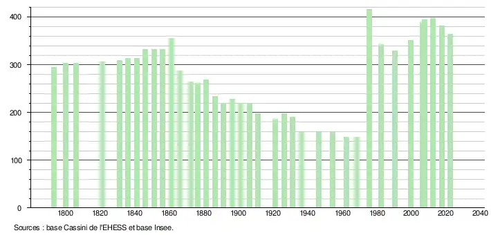 L'évolution du nombre d'habitants est connue à travers les recensements de la population effectués dans la commune depuis 1793. Pour les communes de moins de 10 000 habitants, une enquête de recensement portant sur toute la population est réalisée tous les cinq ans, les populations de référence des années intermédiaires étant quant à elles estimées par interpolation ou extrapolation[17]. Pour la commune, le premier recensement exhaustif entrant dans le cadre du nouveau dispositif a été réalisé en 2007[18].