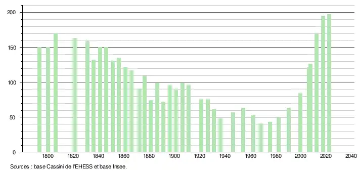 L'évolution du nombre d'habitants est connue à travers les recensements de la population effectués dans la commune depuis 1793. Pour les communes de moins de 10 000 habitants, une enquête de recensement portant sur toute la population est réalisée tous les cinq ans, les populations de référence des années intermédiaires étant quant à elles estimées par interpolation ou extrapolation[16]. Pour la commune, le premier recensement exhaustif entrant dans le cadre du nouveau dispositif a été réalisé en 2007[17].
