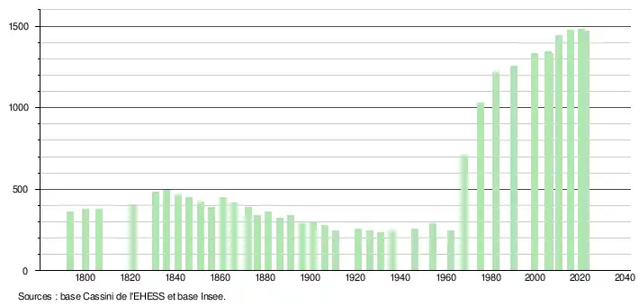 L'évolution du nombre d'habitants est connue à travers les recensements de la population effectués dans la commune depuis 1793. Pour les communes de moins de 10 000 habitants, une enquête de recensement portant sur toute la population est réalisée tous les cinq ans, les populations de référence des années intermédiaires étant quant à elles estimées par interpolation ou extrapolation[21]. Pour la commune, le premier recensement exhaustif entrant dans le cadre du nouveau dispositif a été réalisé en 2005[22].